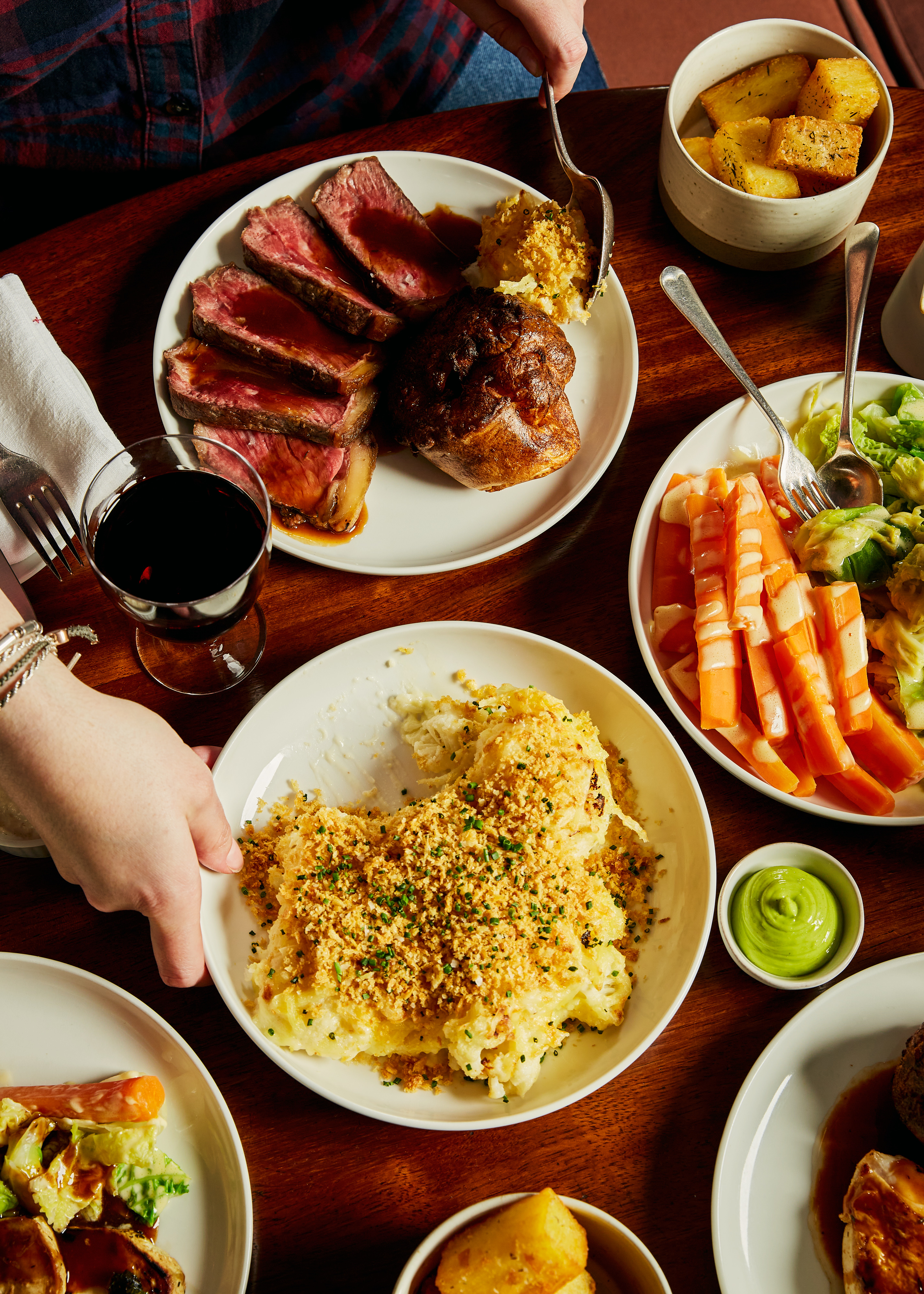 All of our roasts are served with Crispy Potatoes, Cauliflower Cheese, Honey Glazed Carrots, Hispi Cabbage, Yorkshire Pudding & Gravy